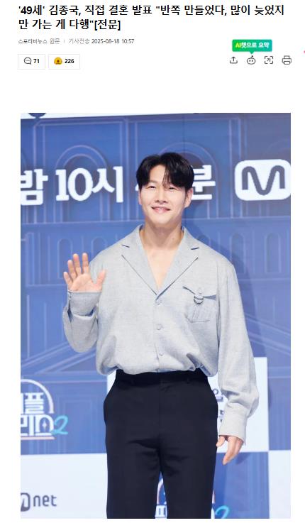 出道30年,单身49载,韩国娱乐圈“黄金单身汉”金钟国终于亲自盖章了自己的终身大事——8月18日,他在粉丝俱乐部发布亲笔信,一句“我要结婚了”直接引爆热搜。这位肌肉猛男难得感性:“虽然很晚才结婚,但能走到这一步真的很幸运。”