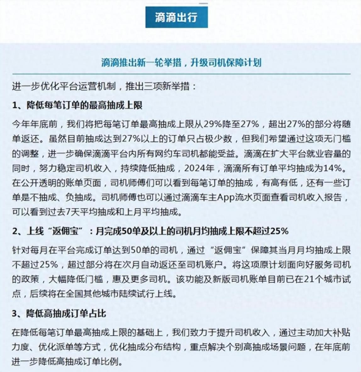 滴滴出行表示年底前将每笔订单最高抽成上限从29%降至27%,超出部分将随单返还。
