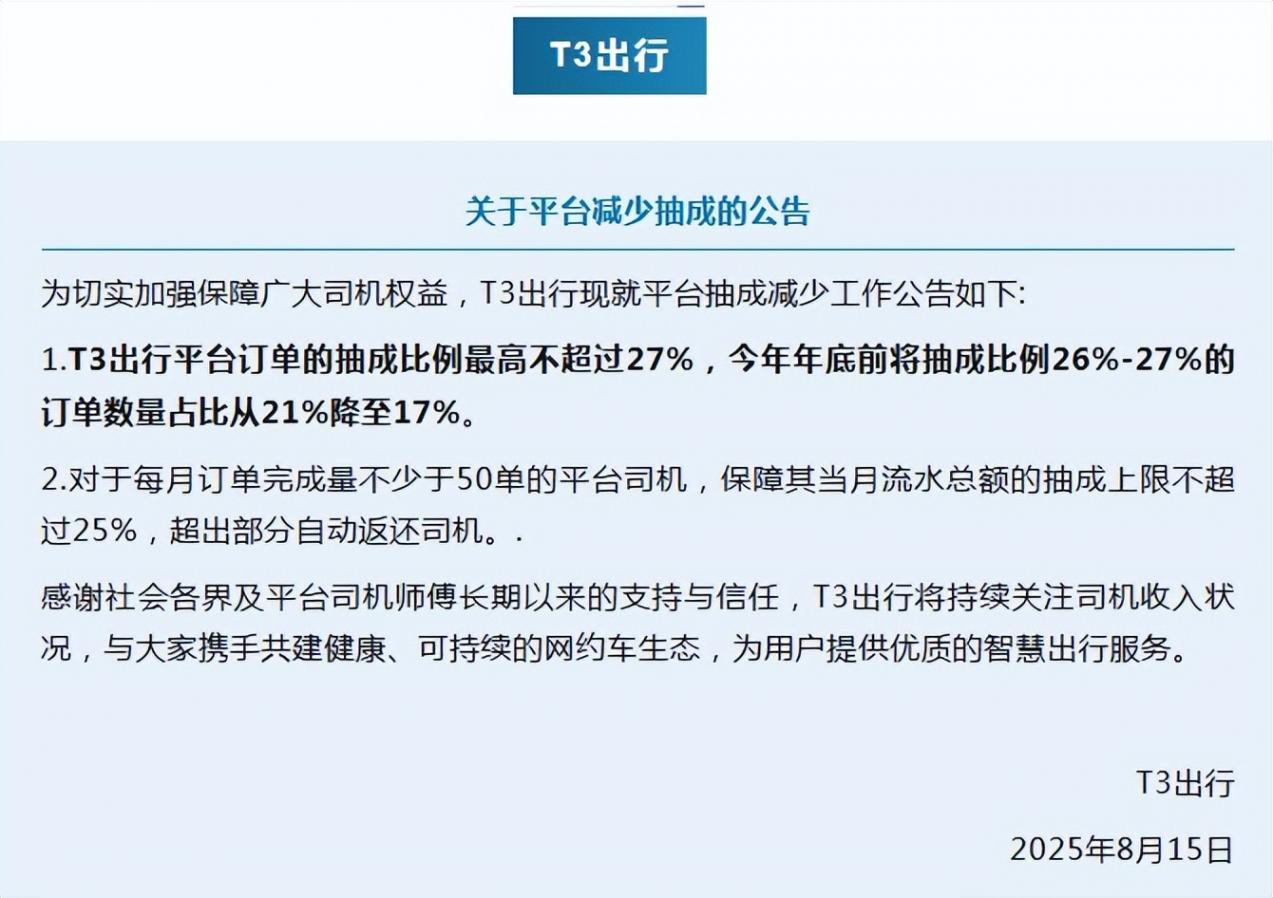 T3出行平台订单的抽成比例最高不超过27%,今年年底前将抽成比例26%-27%的订单数量占比从21%降至17%。