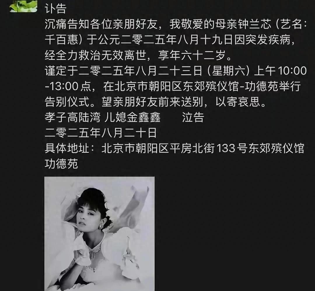 据了解,千百惠的告别仪式已于2025年8月23日在北京举行。