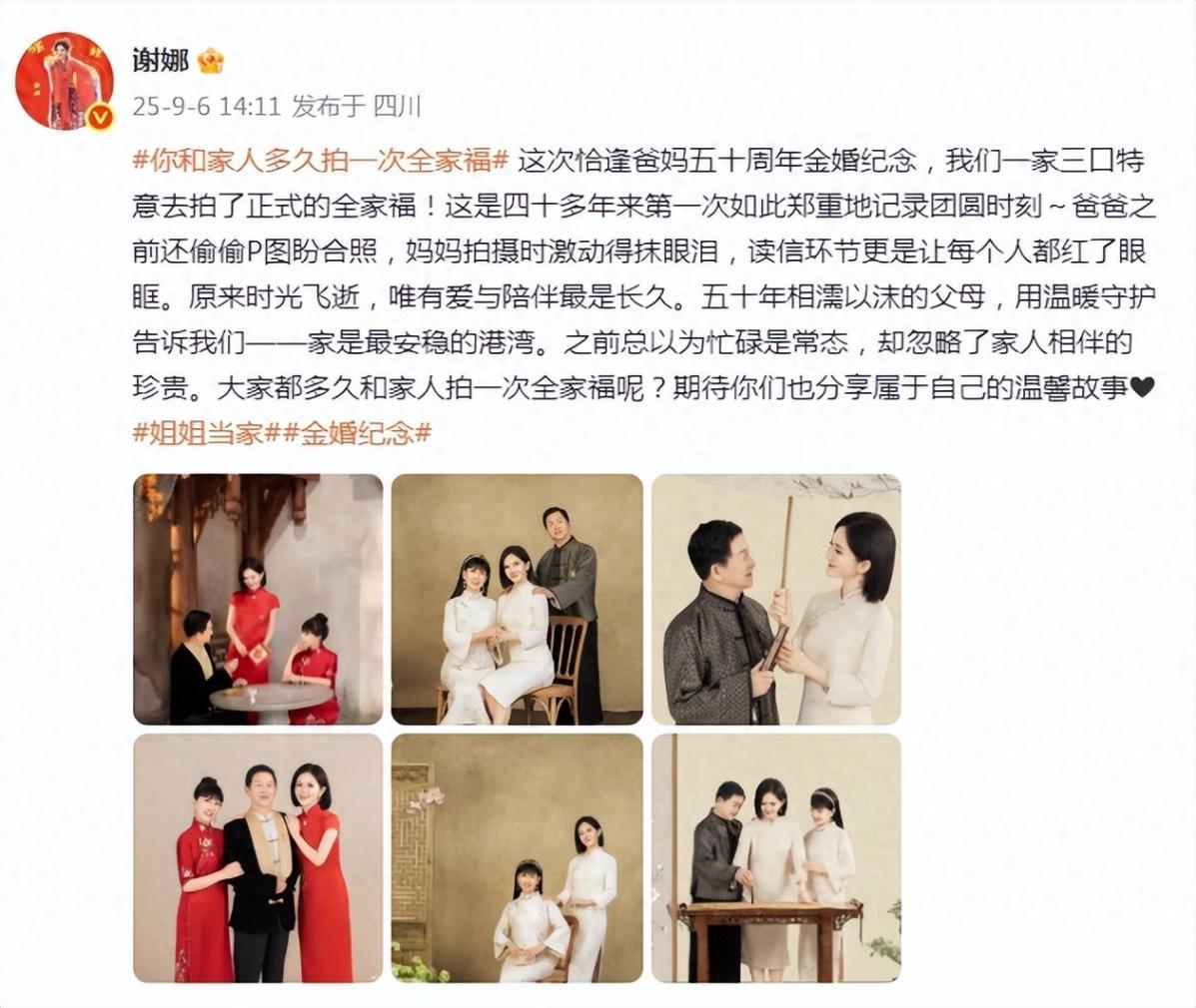 9月6日,谢娜在个人社交平台分享了一组和爸爸妈妈拍摄的全家福秀幸福,这次一家三口穿上中式礼服,仪式感爆棚。谢娜还发文透露这次拍摄全家福恰逢爸爸妈妈结婚五十周年金婚纪念日,简直太有爱了。谢娜直言这是四十多年来第一次和爸爸妈妈如此郑重地记录一家人的团圆时刻,父母都非常激动和感动,字字句句都能感受到谢娜一家三口的温情与幸福。