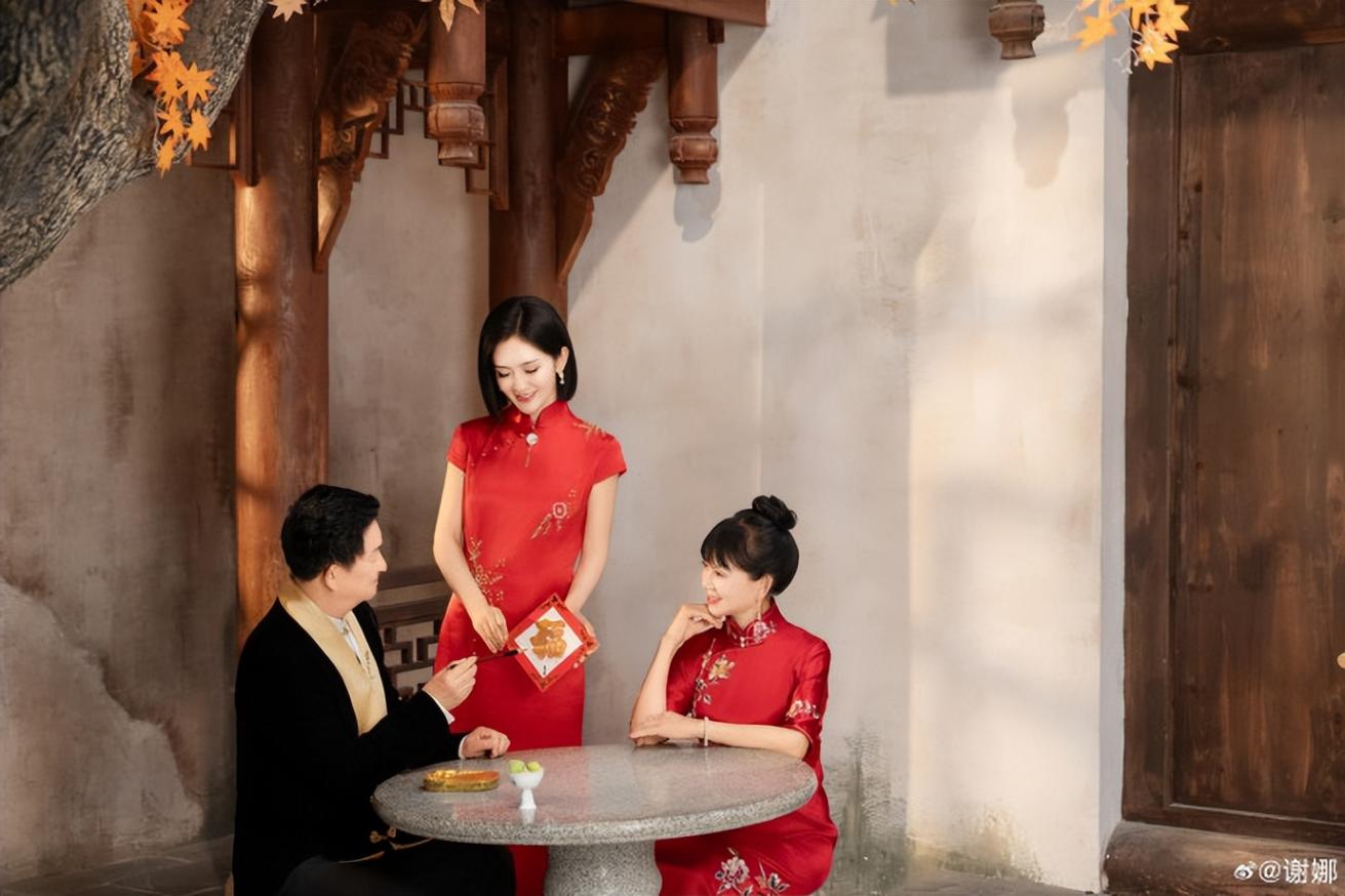 谢娜一头短发利落又减龄,妆容精致的她同样穿着大红色旗袍,迷人又养眼。谢娜站在爸爸的另一侧,一家三口看着镜头都笑得十分幸福甜蜜,确实是太有爱了。