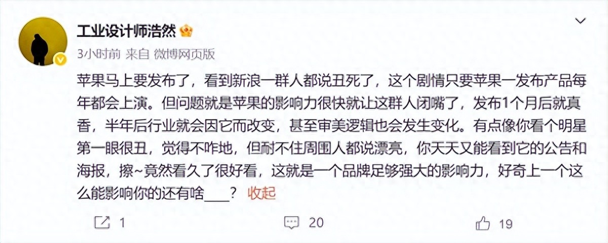 9月8日消息,一加工业设计师刘浩然发文表示,苹果马上要发布了,看到新浪一群人都说丑死了,这个剧情只要苹果一发布产品每年都会上演。