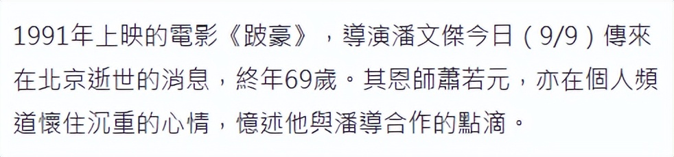 据港媒9月9日报道,香港著名导演潘文杰去世,终年69岁,他的代表作《跛豪》,是香港最优秀的人物电影,在九十年代掀起拍人物传记电影的热潮。