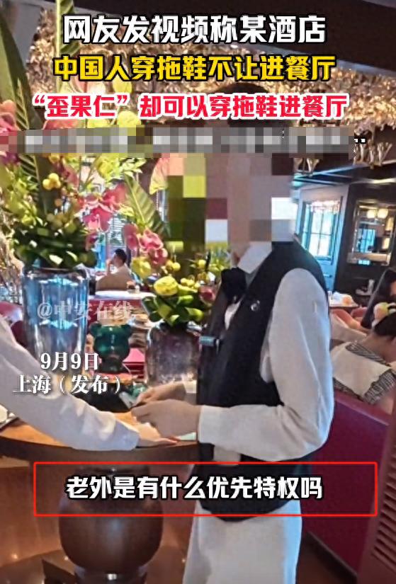 近日,一男子入住某高端酒店,发现朋友穿拖鞋不让进餐厅,几名老外却堂而皇之地穿着进去了,令人气愤。