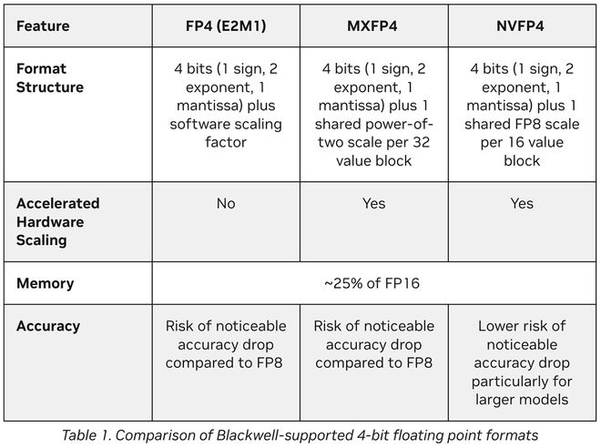 相比之下,今年3月发布的Rubin GPU,在FP4精度下峰值推理能力为50PFLOPS。而英伟达在今年6月才公布创新型4位浮点格式NVFP4,这种格式的目标是在超低精度下力求保持模型性能。