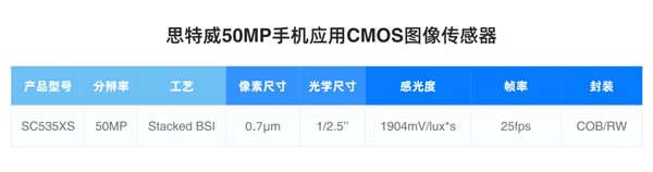 核心参数上,SC535XS拥有5000万像素,单位像素尺寸0.7μm,光学尺寸1/2.5英寸,感光度1904mV/lux*s。