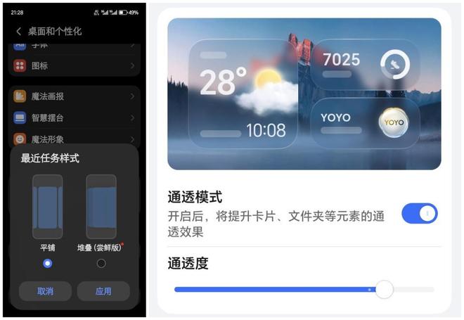 简单来说就是桌面也有类似友商OS26的玻璃效果,荣耀手机把这种模式叫做通透模式,并且可以自由调节通透程度。