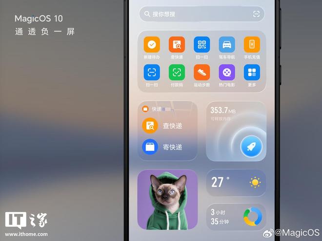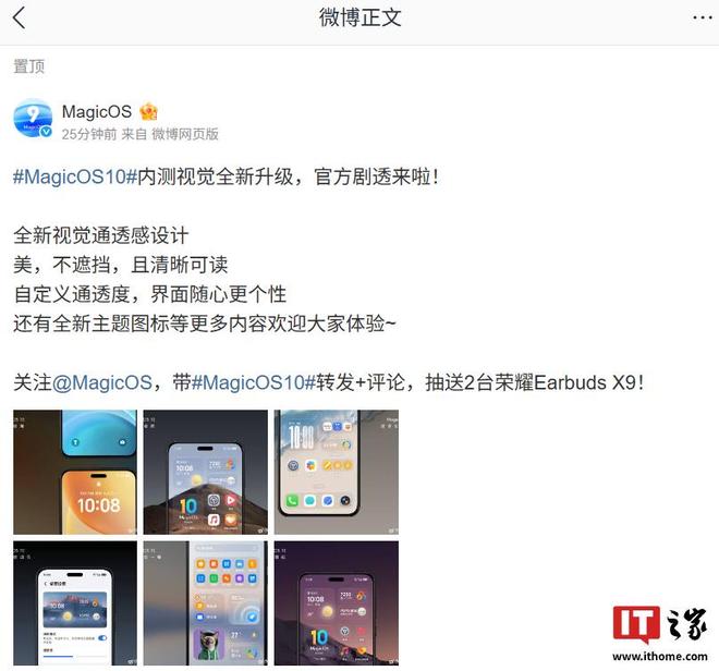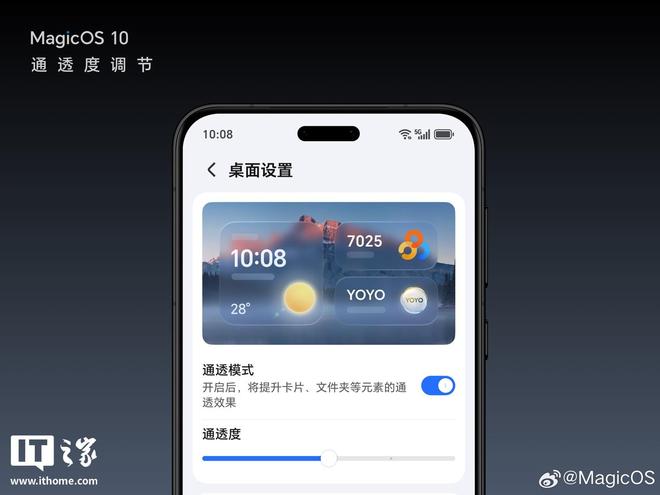 9 月 11 日消息,荣耀 MagicOS 官方微博今日“剧透”:MagicOS10 内测版采用全新视觉通透感设计,支持通透模式和自定义通透度等功能,同时官方还提供全新主题图标等。