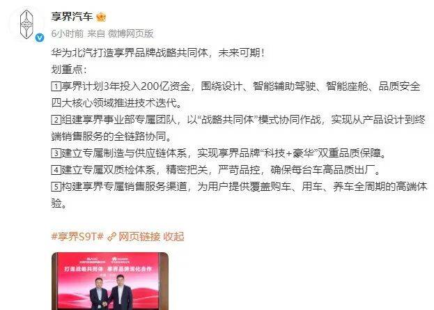 享界汽车官方宣布,华为北汽打造享界品牌战略共同体,重点内容如下: