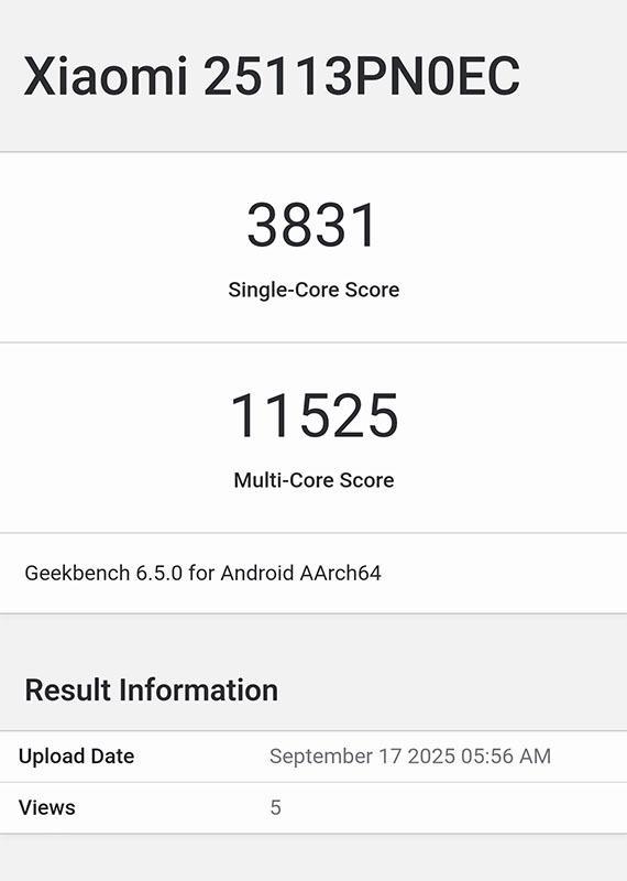 据爆料者透露,一款型号为25113PN0EC的小米手机跑分曝光,这款手机就是小米即将发布的新机小米17 Pro,该机搭载第五代骁龙8至尊版处理器,跑分成绩十分抢眼,单核成绩3831分,多核成绩11525分。