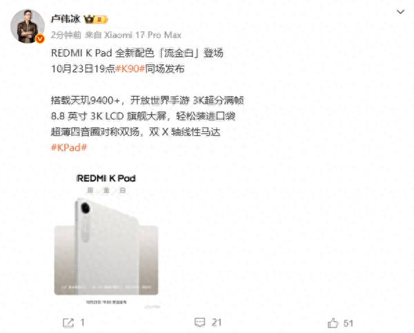 10月19日消息,今日,小米集团总裁卢伟冰宣布,REDMI K Pad全新配色流金白登场,将于10月23日和REDMI K90同场发布。