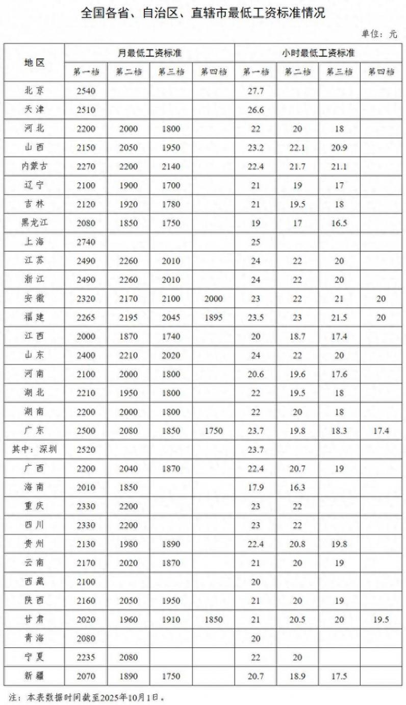 近日,人力资源和社会保障部网站公布全国各省、自治区、直辖市最低工资标准情况(截至2025年10月1日)。从月最低工资标准看,上海以2740元的标准居全国首位;从小时最低工资标准看,北京以27.7元的标准为全国最高。