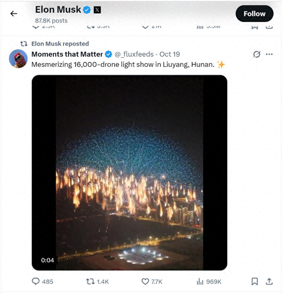 浏阳烟花又一次在海外掀起热度。10月19日,特斯拉创始人埃隆・马斯克在推特上转发“浏阳创意烟花与无人机共舞破吉尼斯世界纪录”的新闻,引发海外网友关注与热评。