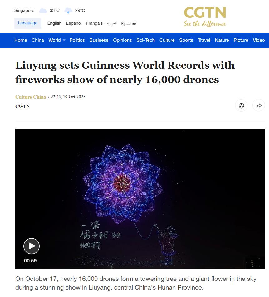 今天(10月20日),中国国际电视台(CGTN)也以《Liuyang sets Guinness World Records with fireworks show of nearly 16,000 drones》(《浏阳近16000架无人机烟花秀创造新的吉尼斯世界纪录》)为题报道此事。