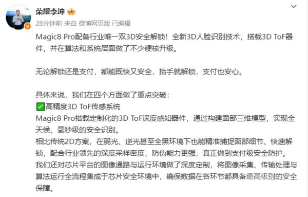 10月22日,荣耀产品经理李坤发文详细介绍了Magic8 Pro在安全解锁领域的重大突破——配备行业唯一的双3D安全解锁功能。据CNMO了解,该机搭载3D ToF器件,支持全新3D人脸识别技术。