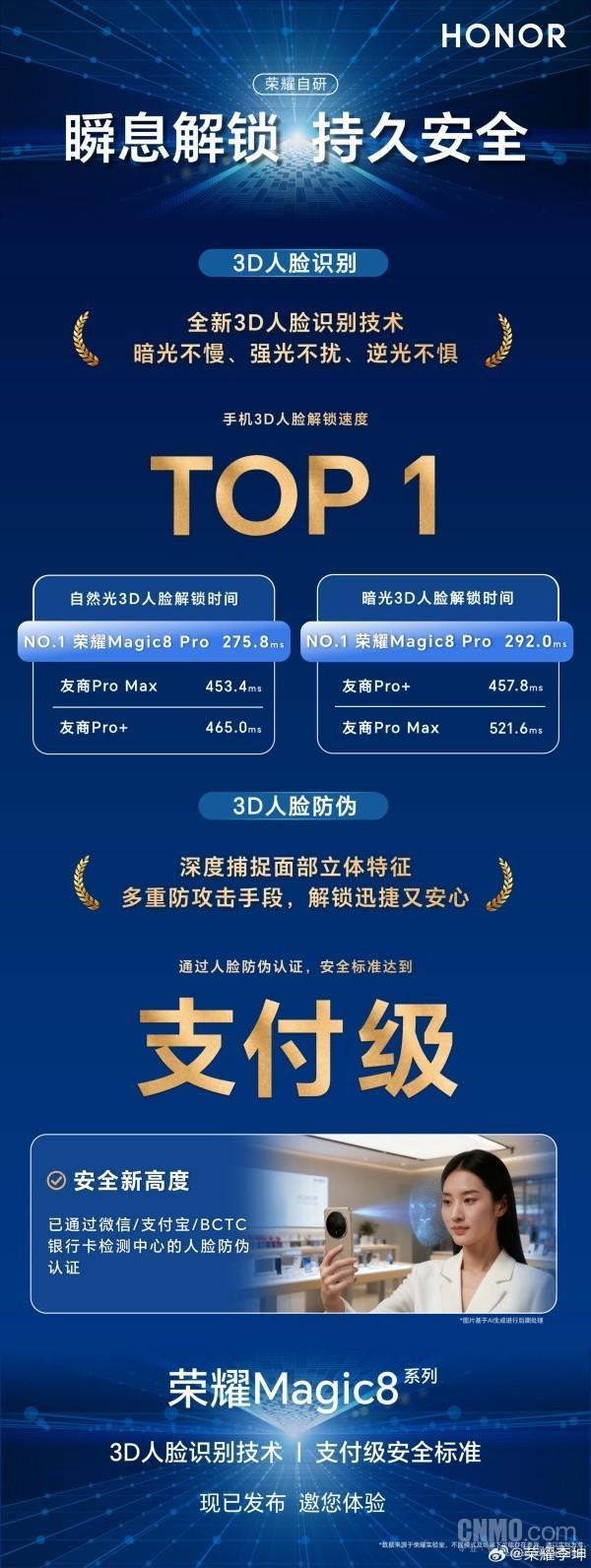 以下是荣耀Magic8 Pro在3D人脸识别技术上实现的四大重点突破: