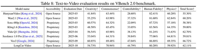 美团已在多项公开与内部测评中将LongCat-Video与其他视频生成大模型进行了比较。在VBench公开基准测试中,LongCat-Video总得分仅次于Veo3和Vidu Q1。值得注意的是,LongCat-Video在“常识理解”一项中以70.94%的得分位居所有开源模型第一,也超过了Veo3、Seedance 1.0 Pro、Vidu Q1、Kling 1.6、Sora等闭源模型。
