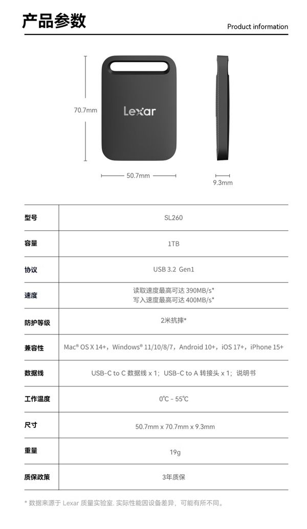 作为一款移动SSD,Air小轻块具备2米抗摔能力,日常磕碰或不慎掉落无需担忧数据丢失,每位用户还可免费享受一次价值2000元的数据恢复服务。