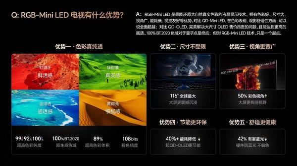 从技术发展趋势看,RGB-Mini LED代表着高画质液晶显示技术的未来方向,凭借在色彩表现、能效控制、使用寿命等方面的综合优势,成为新一代液晶显示技术的最优选择。随着产业链的成熟和成本的下降,RGB-Mini LED有望成为高端电视的标配技术。