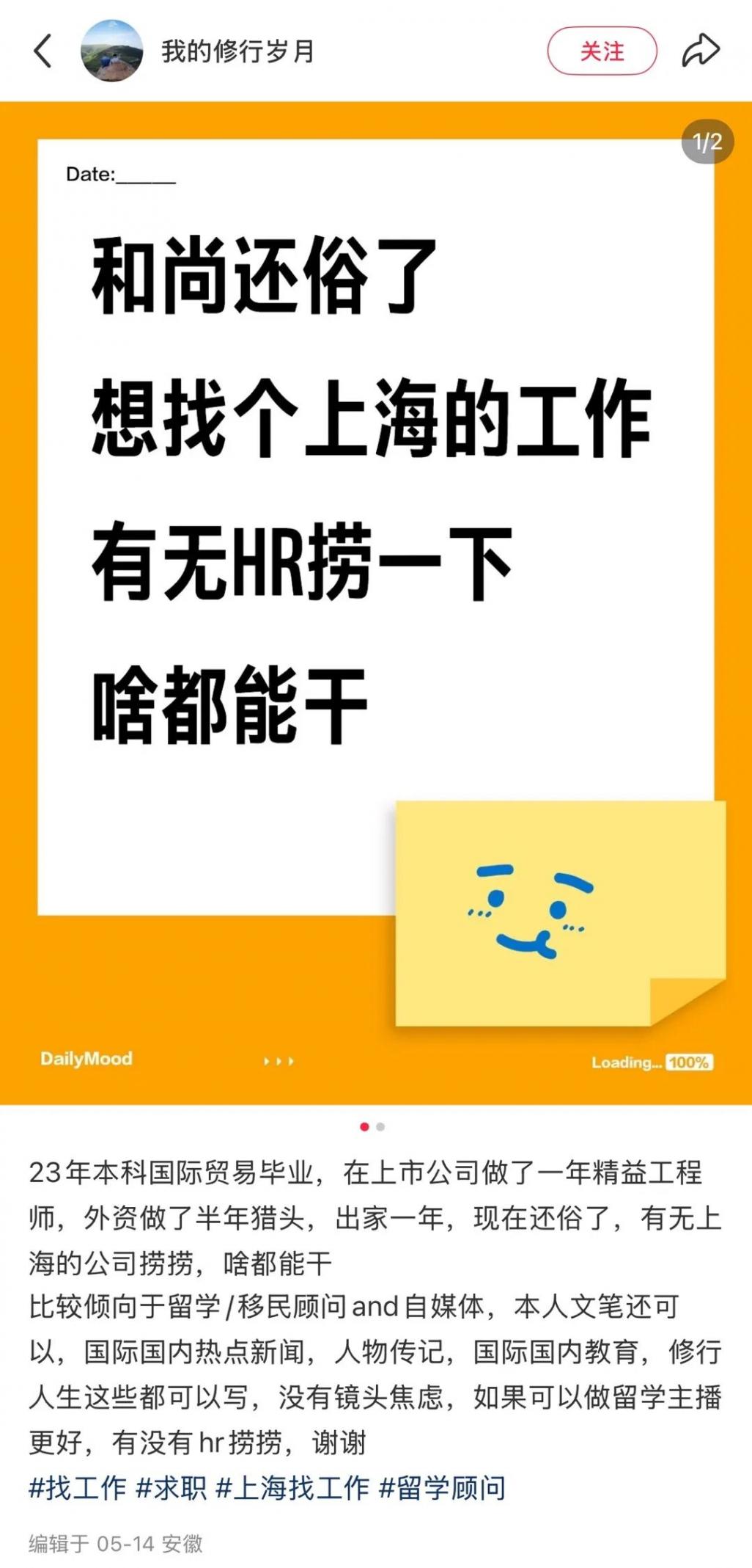▲ 还俗前嘉翊在社交媒体上求职。图 / 小红书@我的修行岁月
