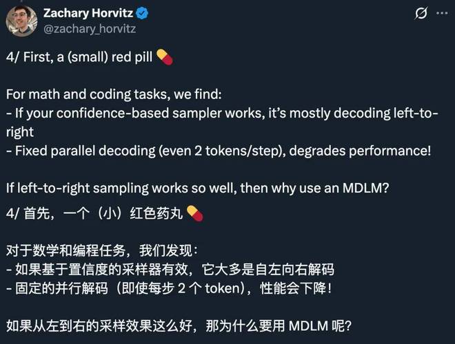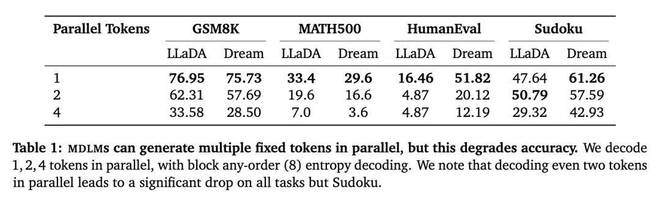 然而,最近的一篇论文有了一些意外发现:在数学和编码任务中,任意顺序算法的性能往往不如从左到右采样,或者表现与之相似,而标准的多 token 解码会显著降低性能。即使仅在两个 token 上进行并行解码,模型在主流基准任务上的性能也会显著下降。