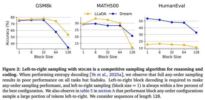 使用 MDLM 进行从左到右的采样是一种适用于推理和编码的高效采样算法。如果没有 [Arriola et al., 2025] 提出的块大小(block sizes)来强制形成半自回归(AR)的从左到右结构,任意顺序会显著影响性能。
