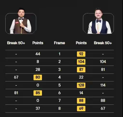 比赛开局便呈现一边倒态势,丁俊晖频频出现防守失误和进攻犹豫,墨菲则手感火热,迅速以3-0建立领先优势。尽管丁俊晖在局歇前扳回一局,并在中场后再胜一局将比分追至2-4,但关键局中未能把握机会。墨菲先后打出两杆破百(104、114)和三杆50+,凭借精准的进攻和稳定的发挥,以88分拿下赛点,并最终以67分锁定胜局。