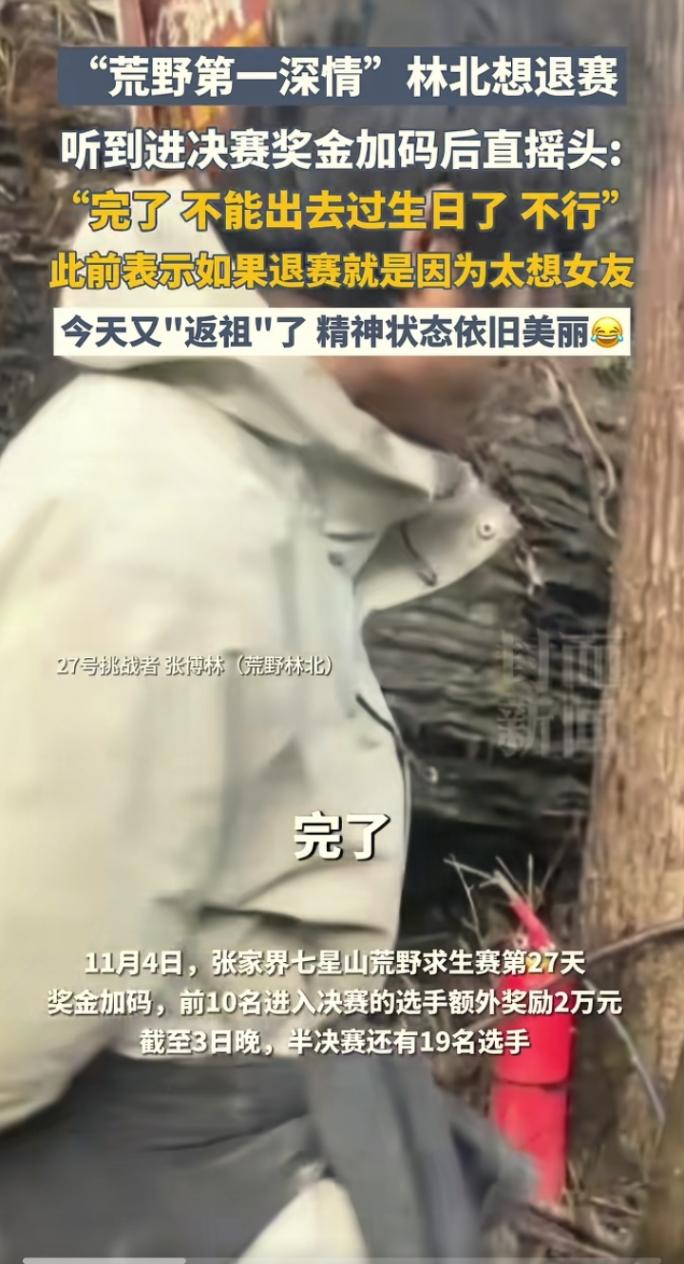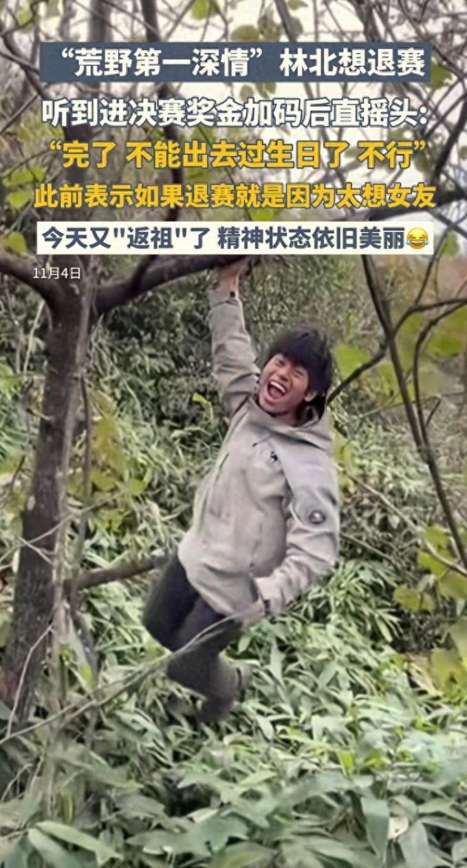 说的是那个叫“荒野第一深情”的林北,估计是在哪个荒野求生节目里被折磨得够呛,扛不住了,当场就想“撂挑子”不干了。这太正常了,咱们普通人别说在荒野里找吃的了,就是断网一天都觉得活不下去,对吧?