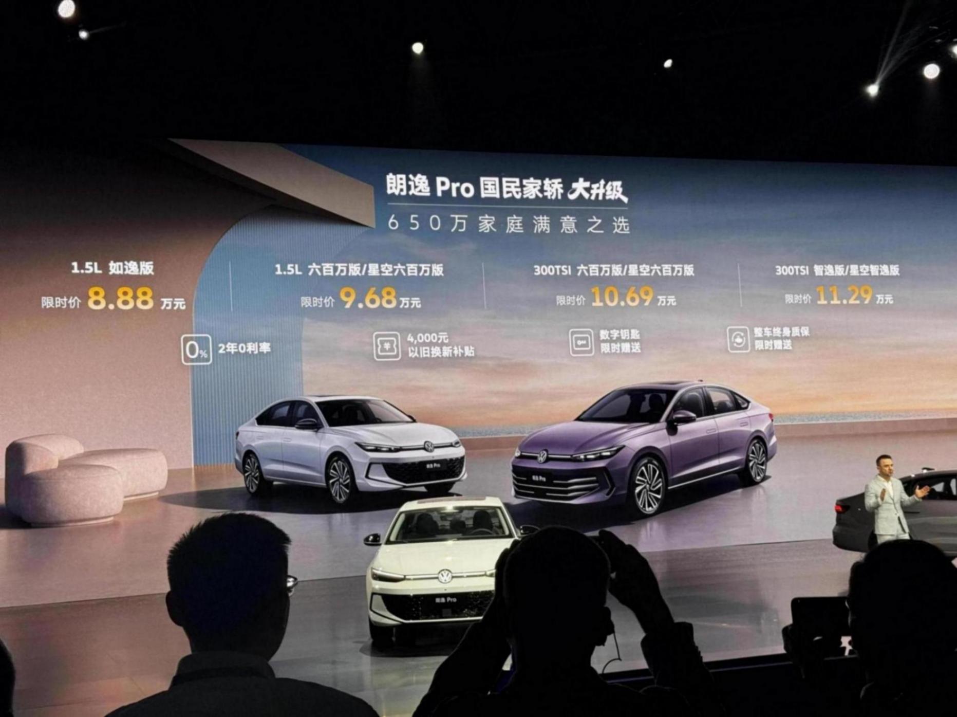 第一代朗逸设计团队,再度打造大众朗逸Pro。按上汽大众把中期改款算上的说法,这是第五代产品。PQ34升级平台出发、2018年切换MQB架构,再到基于MQB evo的朗逸Pro,它已经和过去截然不同——朗逸Pro完全融入上汽大众Pro家族,同样有星空前脸,俨然是小一圈的帕萨特Pro,尤其10.25英寸仪表盘、12.9英寸中控屏和怀挡电子换挡杆,把车内布置得颇具“电感”,还标配微信在内的腾讯生态,配合云母白内饰和紫色车漆,让朗逸Pro追上时代脚步。