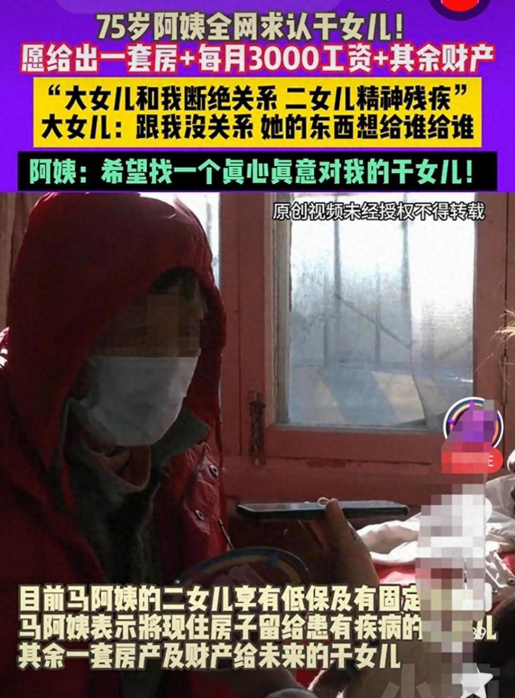 原来阿姨老伴去世的早,膝下有两个女儿,大女儿前几年断绝了与她的关系,至于什么原因,他也没有过多的透露,而二女儿精神有问题,生活不能自理,为了防老,所以在网上发布了认干女儿的通告。