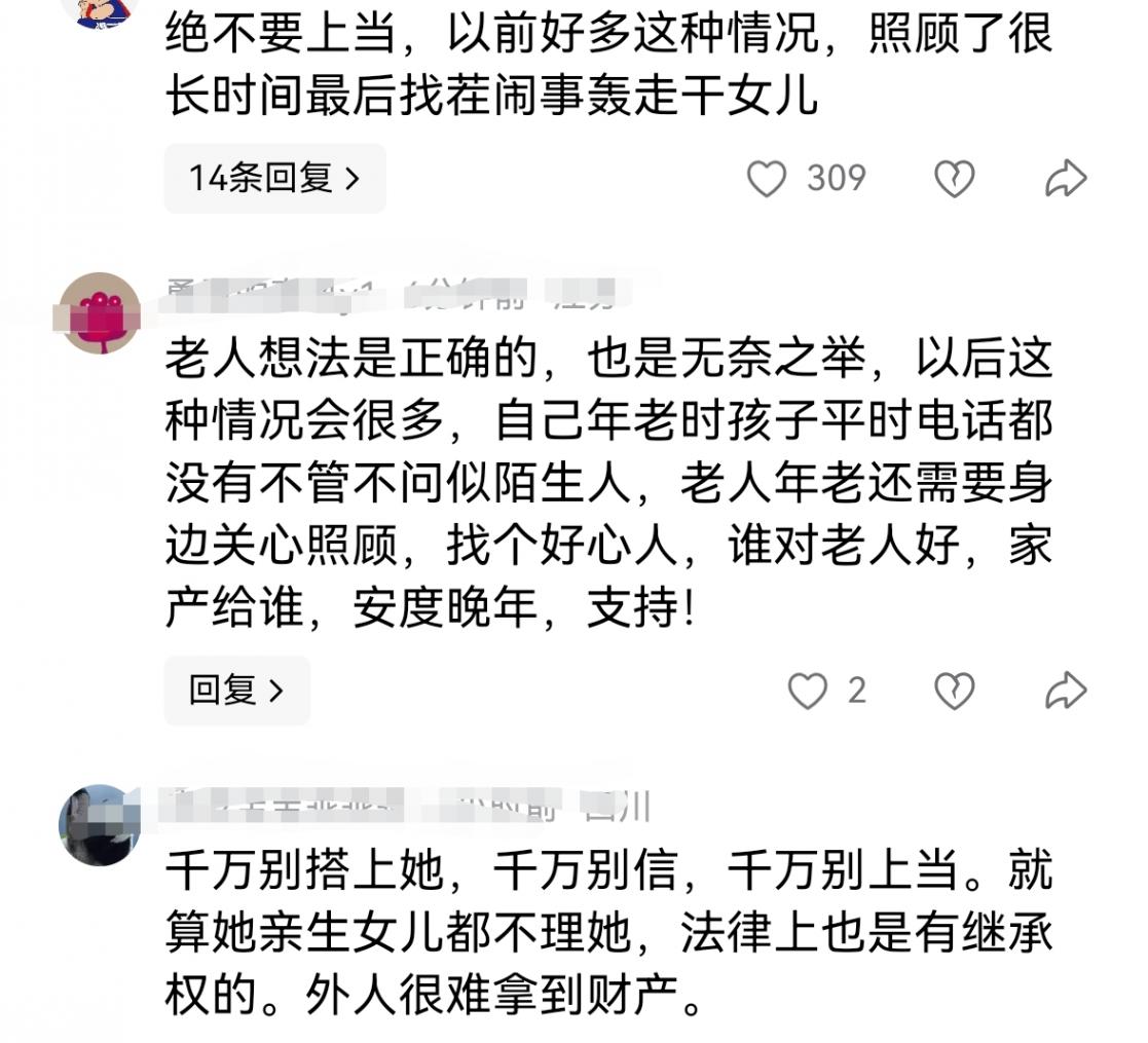 有的说阿姨,虽然现在生活无人照顾,等到真正找到干女儿后,照顾一段时间后,会以各种理由轰走干女儿。认为这只是一个骗局,就算她亲生女儿都不管她,法律上也有继承权的,外人很难拿到财产。
